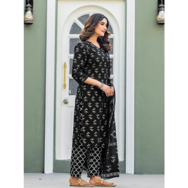 Generic Women’s Cotton Blend Printed Kurti With Pant Dupatta Set (Black)